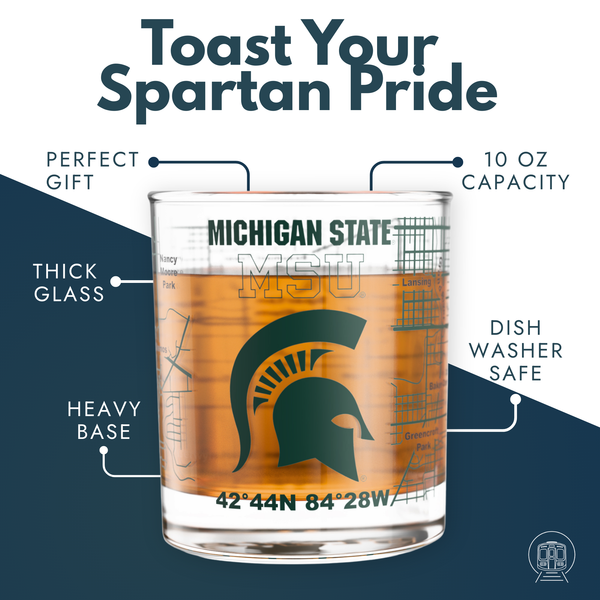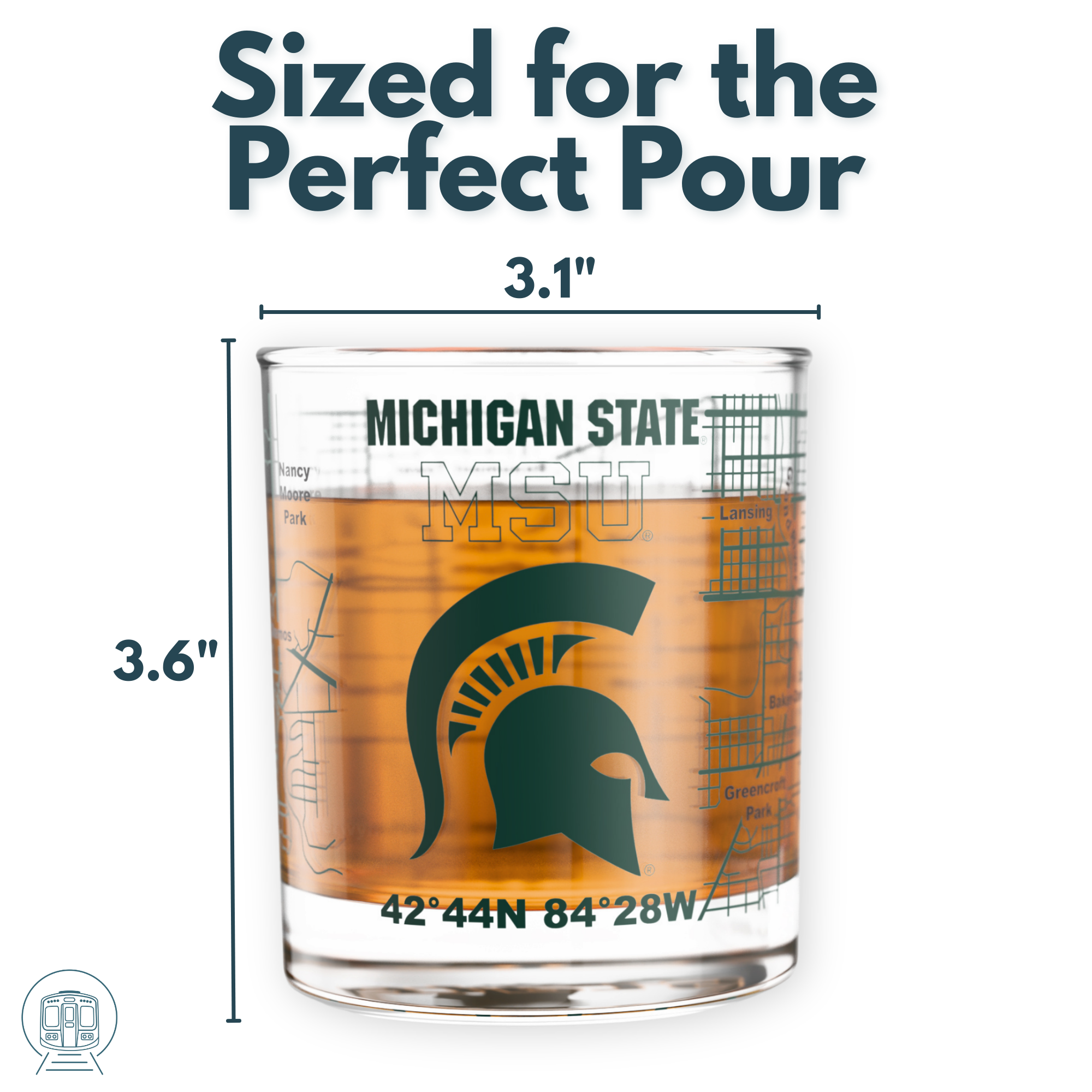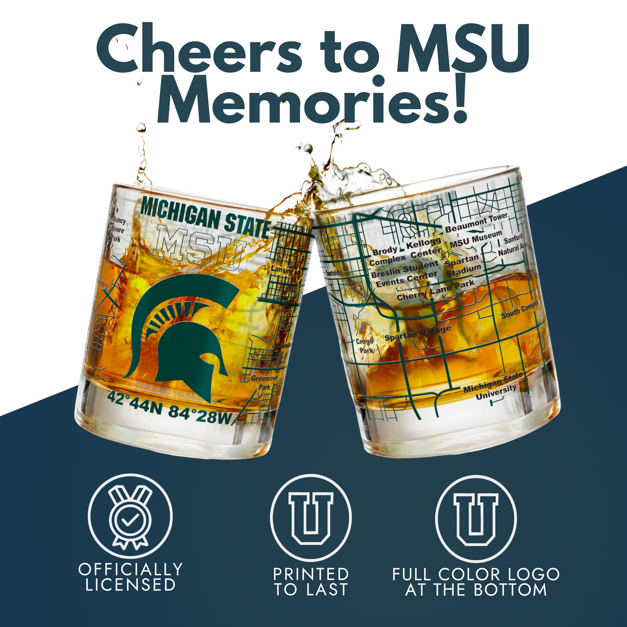 • Officially Licensed Michigan State University Spartans Drink ware - Enjoy a classic cocktail with these school spirit whiskey sets. Each set contains 2 low ball rocks glasses featuring the university's full color logo and an authentic campus map with key landmarks included!