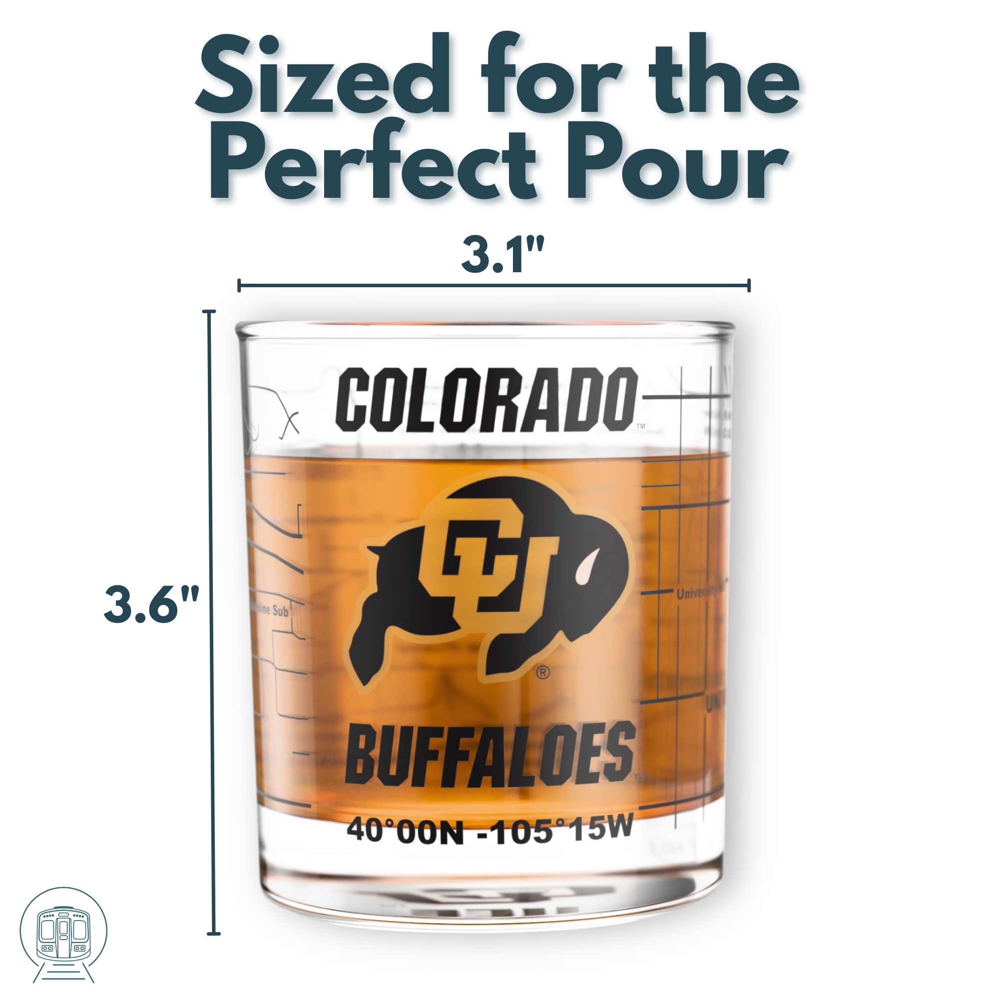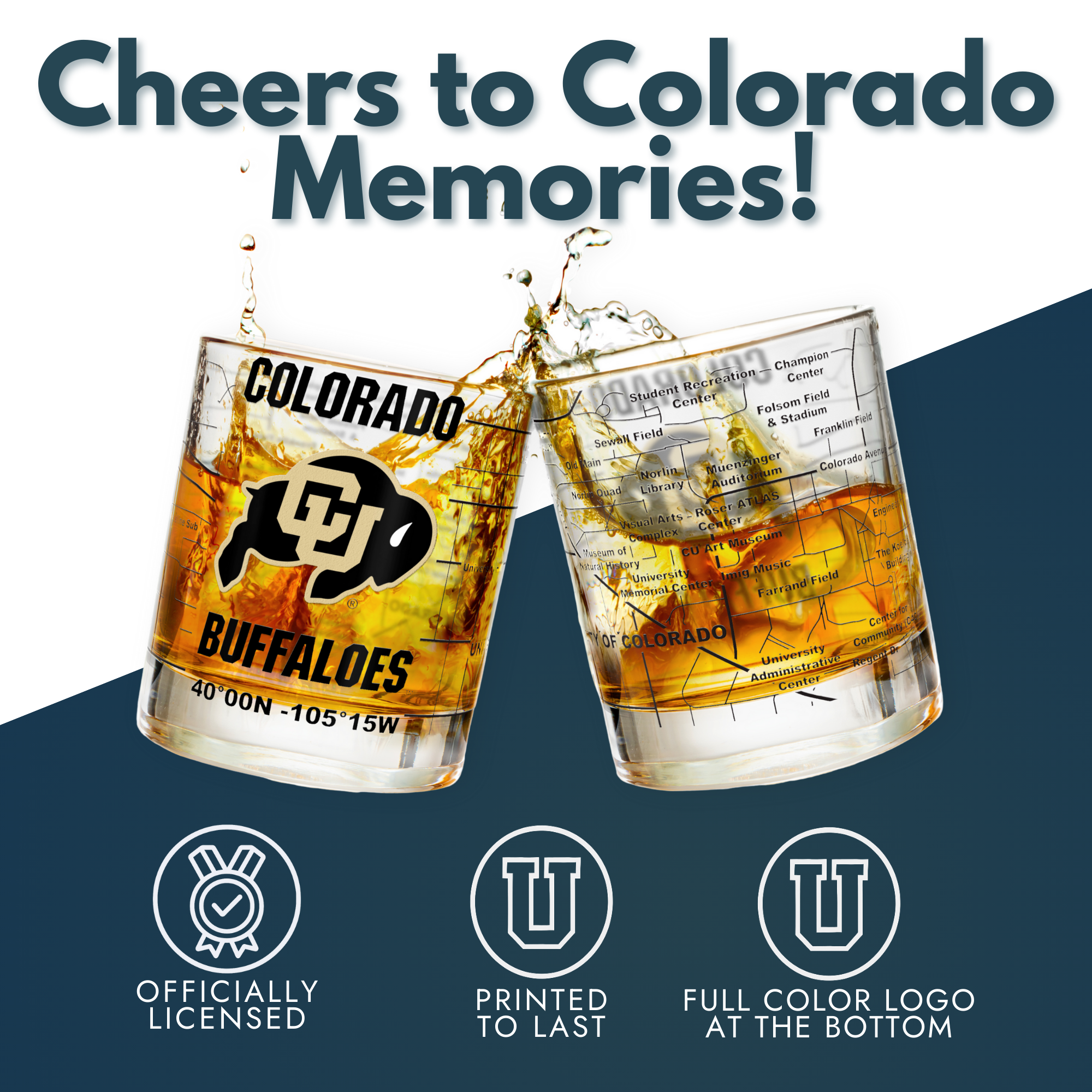 • Officially Licensed University of Colorado Drinkware - Enjoy a classic cocktail with these school spirit whiskey sets. Each set contains 2 low ball rocks glasses featuring the university's full color logo and an authentic campus map with key landmarks included!