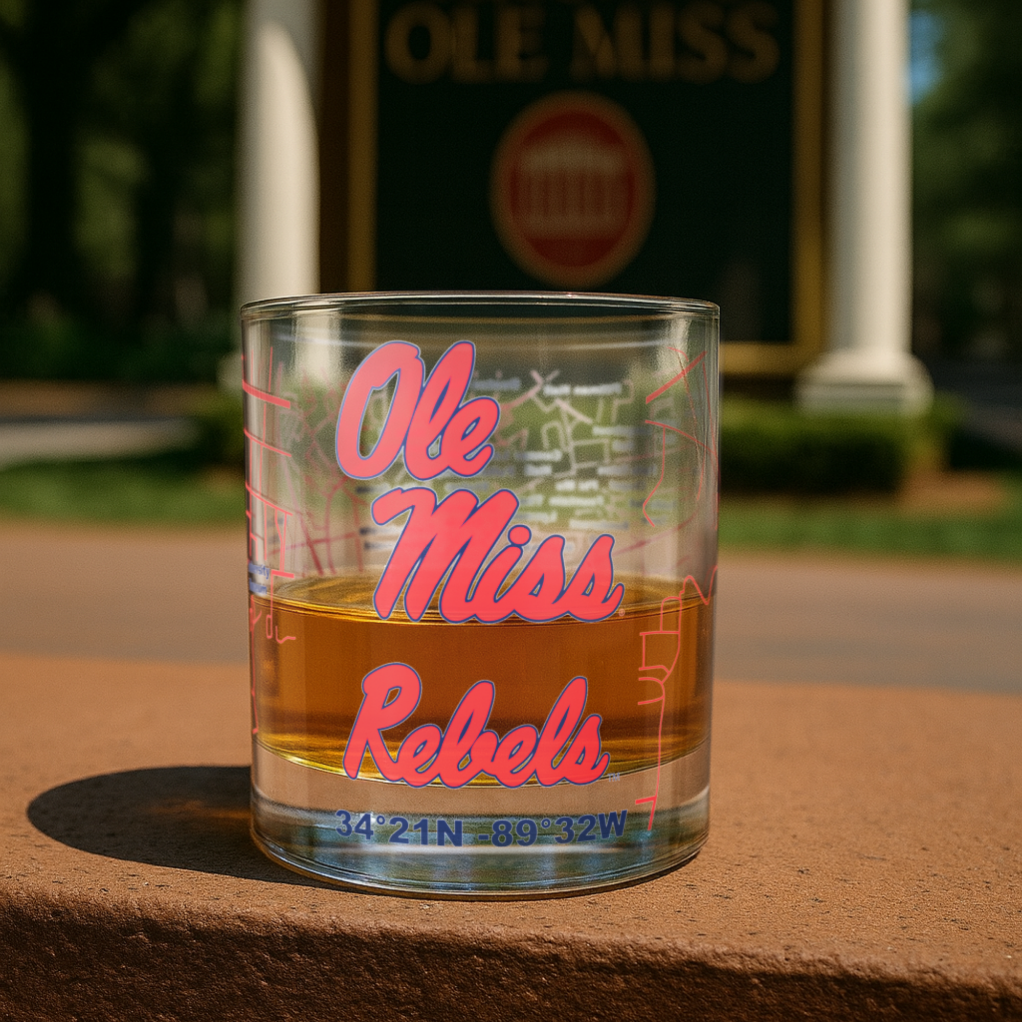 • Officially Licensed University of Mississippi Rebels Drinkware - Enjoy a classic cocktail with these school spirit whiskey sets. Each set contains 2 low ball rocks glasses featuring the university's full color logo and an authentic campus map with key landmarks included!