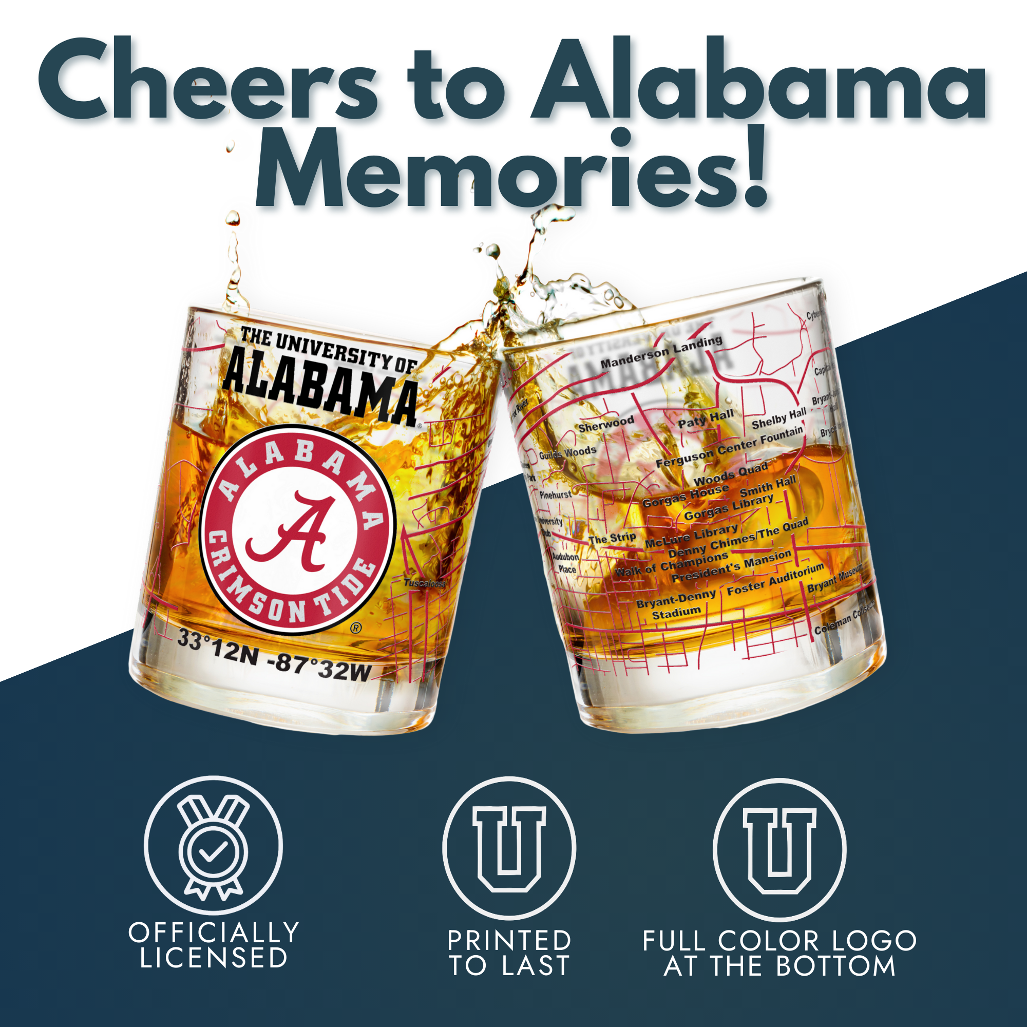 • Officially Licensed Alabama Drinkware - Enjoy a classic cocktail with these school spirit whiskey sets. Each set contains 2 low ball rocks glasses featuring the university's full color logo and an authentic campus map with key landmarks included!